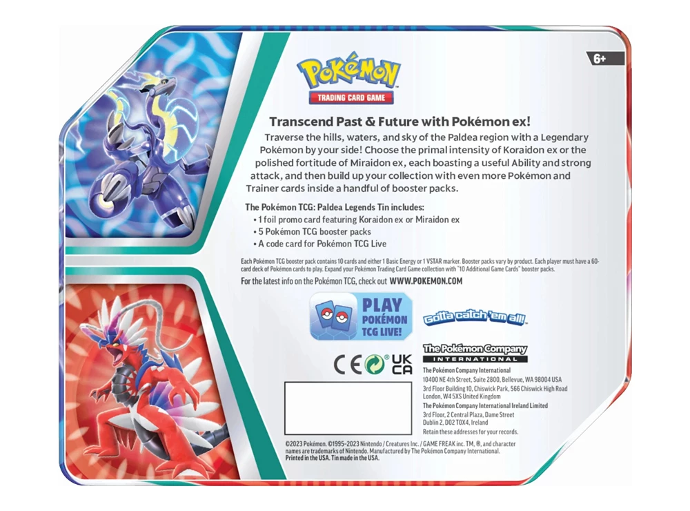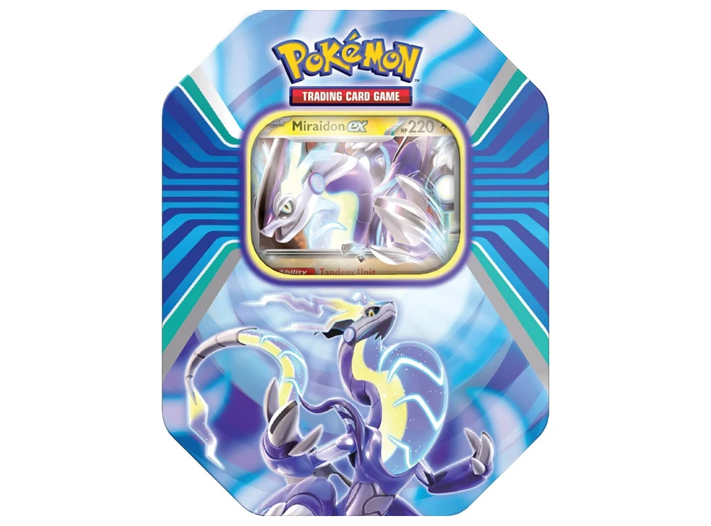 Paldea Legends Miraidon Tin Box από το Pokémon Trading Card Game. Περιλαμβάνει 4 Paldea Legends booster packs, 1 foil promo κάρτα με το Miraidon και κωδικό για το Pokémon TCG Live. Από την Pokémon Company.