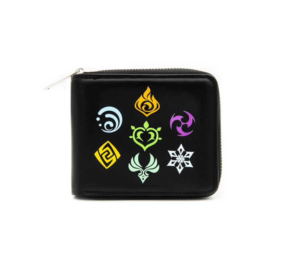 Πορτοφόλι με τα 7 Elements (Pyro, Hydro, Electro, Cryo, Dendro, Anemo, Geo) από το video game Genshin Impact. Πορτοφόλι από δερματίνη, διαστάσεων 11 x 9 εκ., με πολλές εσωτερικές θήκες.