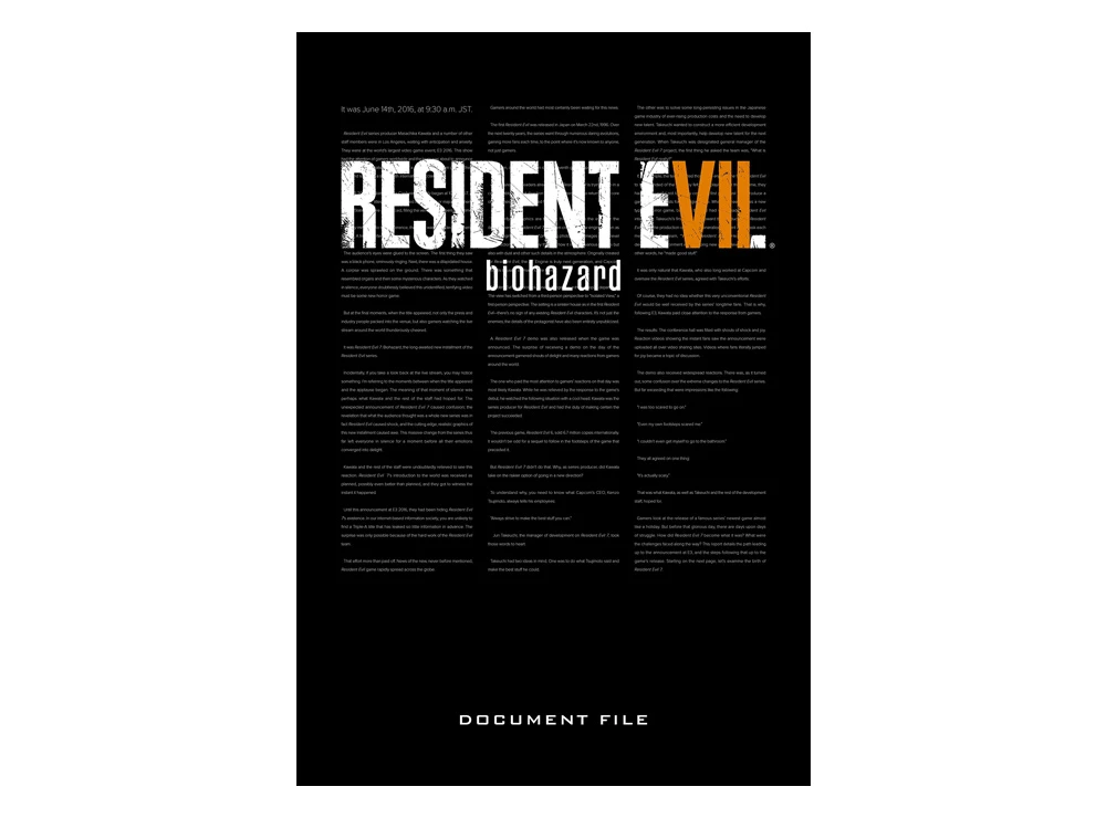 Art book Resident Evil 7: Document File με photo albums, σκηνές από την αρχή ως το τέλος του παιχνιδιού, συνεντεύξεις από τους δημιουργούς και όχι μόνο από τo ομώνυμο video game. Hardcover art book 152 σελίδων, από την Dark Horse.