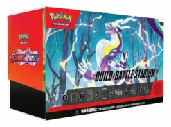 Σετ Scarlet & Violet Build & Battle Stadium Box από το Pokémon Trading Card Game. Περιλαμβάνει 2 Build & Battle Boxes (με deck 40 κάρτών, 1 foil κάρτα και 4 booster packs το καθένα), 3 Scarlet & Violet booster packs, 6 ζάρια damage-counter, 1 νόμισμα, 2 condition markers και το συλλεκτικό κουτί. Από την Pokémon Company.