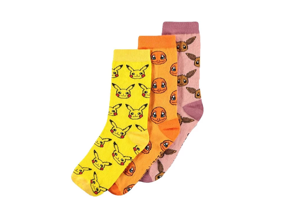 Ζευγάρια κάλτσες με τα Pikachu, Charmander και Eevee από την anime και video game σειρά Pokemon. 3 ζευγάρια κάλτσες από 20% βαμβάκι και 80% πολυεστέρα, μεγέθους 39-42.