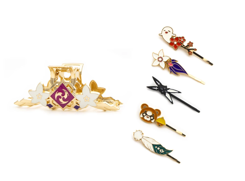 Σετ κλιπ μαλλιών με διάφορα σχέδια από το video game Genshin Impact. Σετ με 1 κοκκαλάκι μαλλιών (κλάμερ) και 5 τσιμπιδάκια μαλλιών, από κράμα μετάλλων.