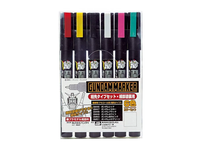 Σετ Μαρκαδόρων Gundam για σκίαση και τελειοποίηση μοντέλου. Οι μαρκαδόροι άριστης ποιότητας χρησιμοποιούνται για το γέμισμα εσοχών (“panel lining”), δίνοντας μια πιο δυναμική εμφάνιση στο μοντέλο. Σετ 6 Μαρκαδόρων σε 6 χρώματα (κόκκινο, κίτρινο, μαύρο, ροζ, meta green και άσπρο για διορθώσεις) κατασκευασμένοι από την GSI Creos.