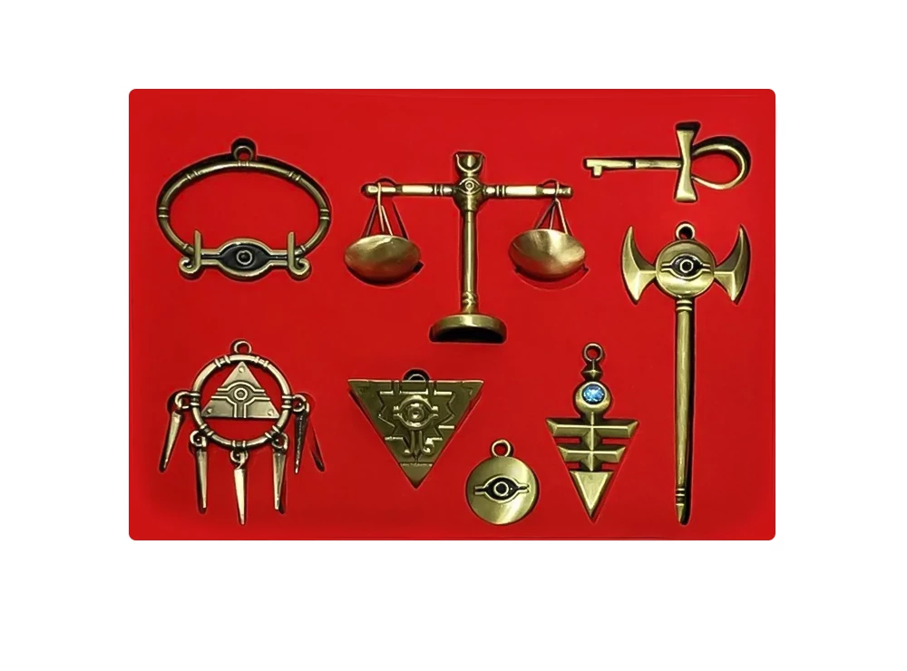 Συλλογή με τα 7 Millennium Items (Puzzle, Ring, Key, Eye, Necklace, Scale & Rod) και το κρεμαστό του Yuma Tsukumo από την anime σειρά Yu-Gi-Oh! Οχτώ αντικείμενα από κράμα μετάλλων ύψους 2~9 εκ. που μπορούν να χρησιμοποιηθούν και ως μπρελόκ ή κρεμαστά.