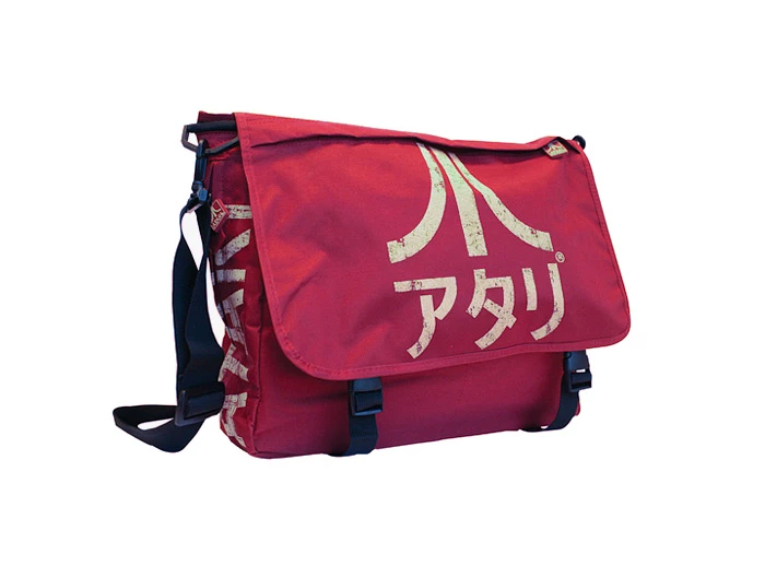 Τσάντα ταχυδρόμου με το ιαπωνικό σήμα της Atari. Κόκκινη από καμβά, διαστάσεων 46 x 37 x 10 εκ. με μία εξωτερική θήκη και άλλη μια εσωτερική.